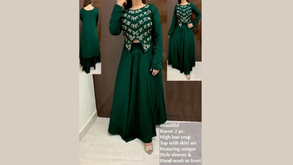 High-Low Crop Top With Skirt With Stylish Sleeves & Hand Work in Front😍